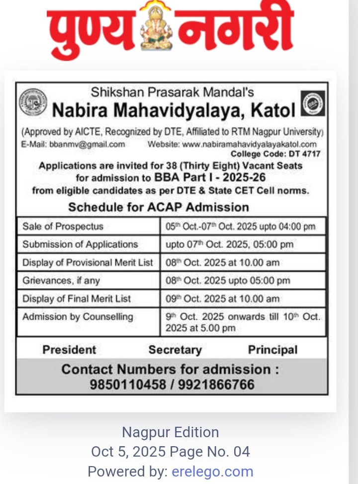 Nabira Mahavidyalaya, Katol Nabira College Campus, Dhantoli, Katol. District: Nagpur, Maharashtra 441302.
